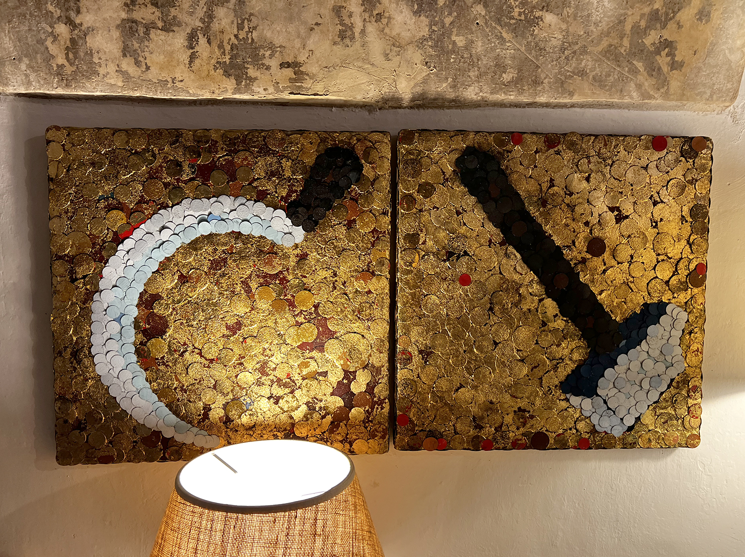 2022 collage di carta vetrata su tela, colori ad olio, foglia d’oro dittico 50×100 cm (50×50 cm cad.)