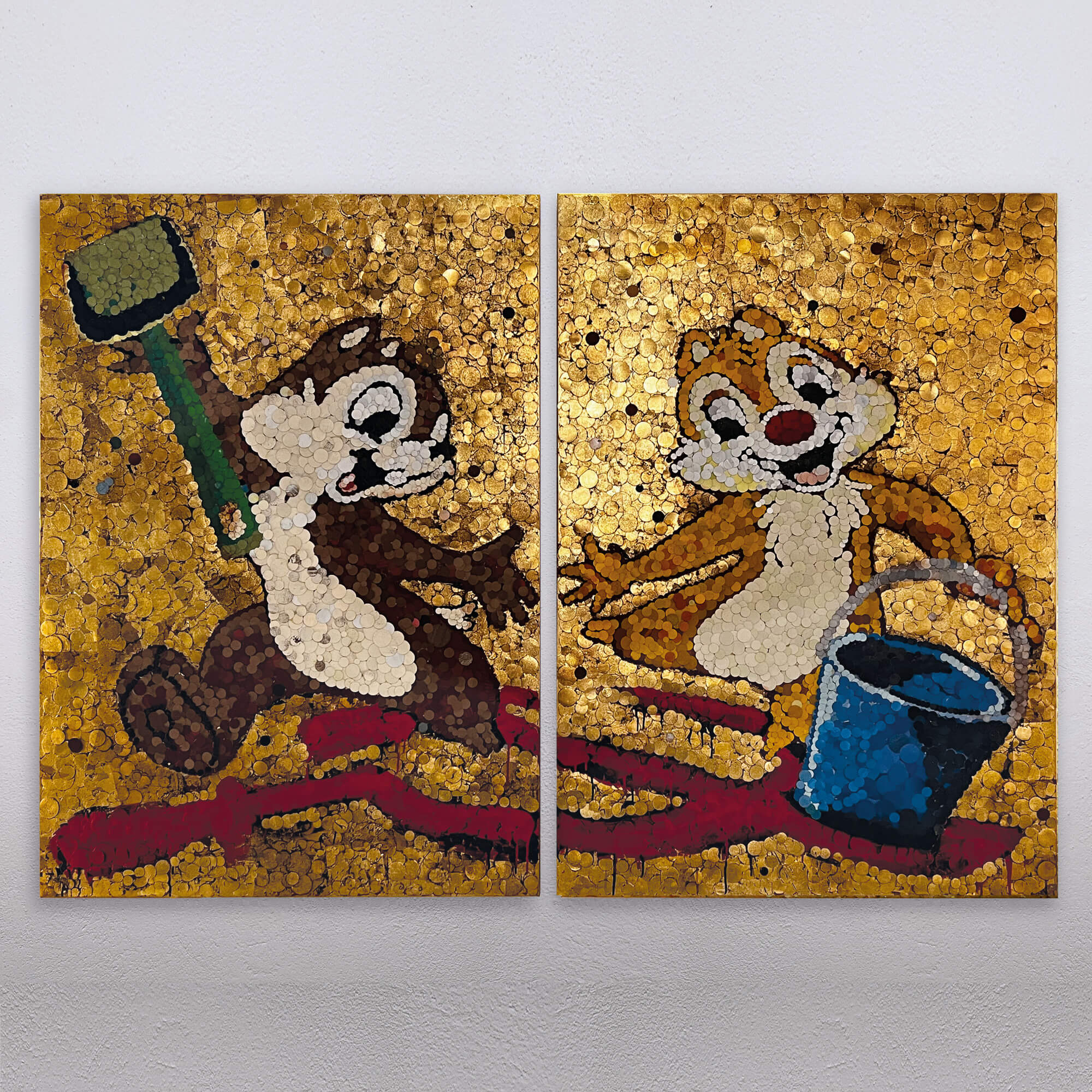 2024 collage di carta vetrata su tela, colori ad olio, foglia d’oro dittico 170x240cm (170x120cm cad.)